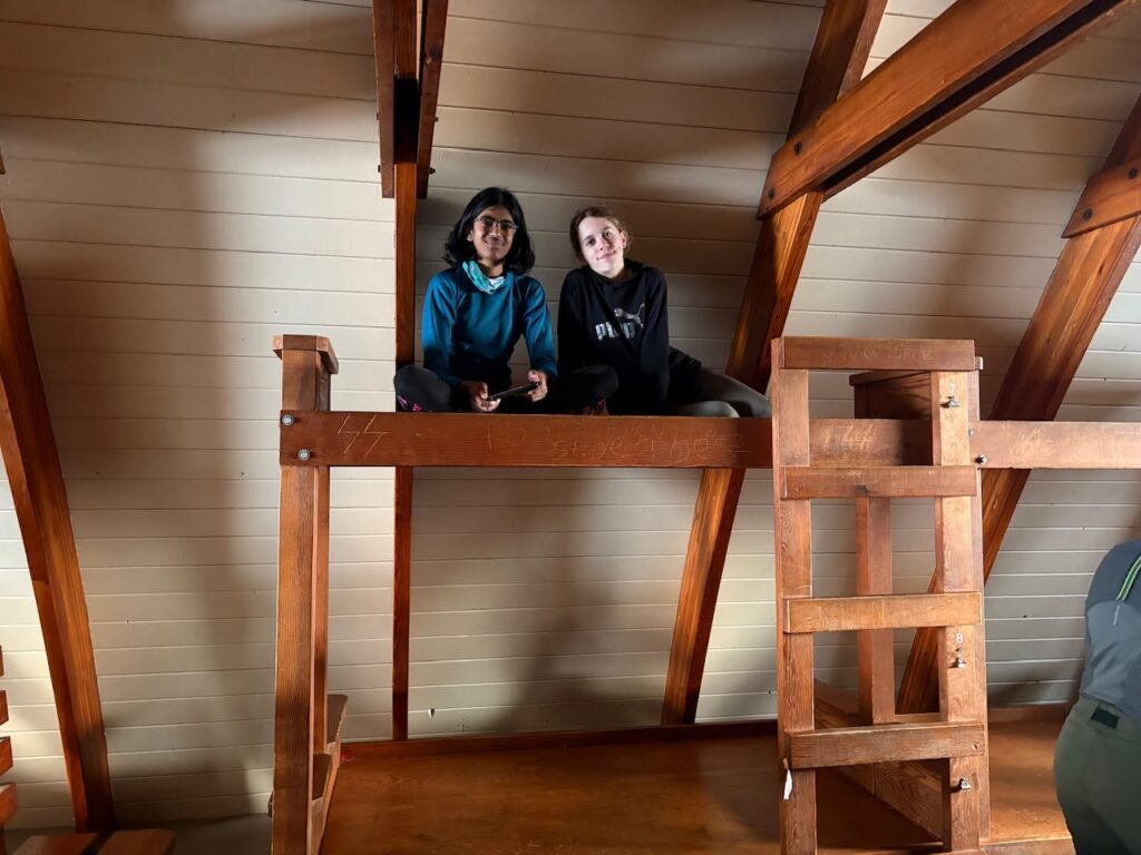 After around 2 1/2 hours, we reached Red Heather Hut. Chloe and IΒ reached Red Heather about 5 minutes before our moms. We felt very proud of ourselves for taking our snowshoes off all by ourselves. We went inside but were too embarrassed to sit next to people who we didn’t know, so we went back outside.