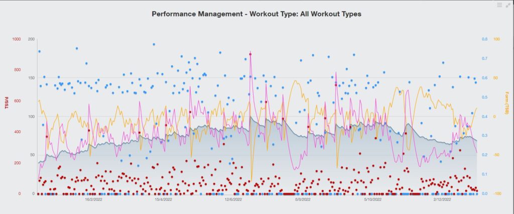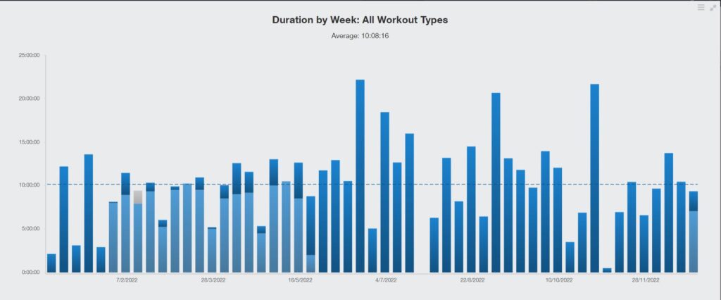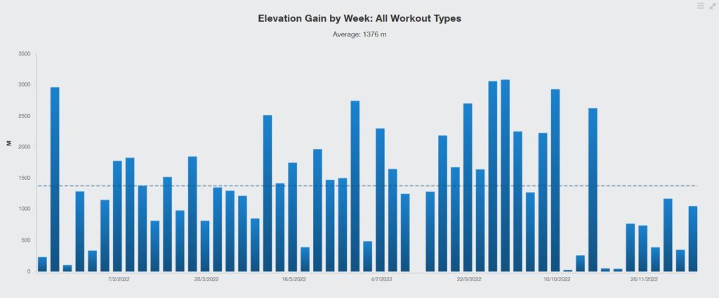 For 2022, my total training and activity (climbing, hiking, skiing, etc.) time added up to about 527 hours, with an average weekly elevation gain of about 1376 m.