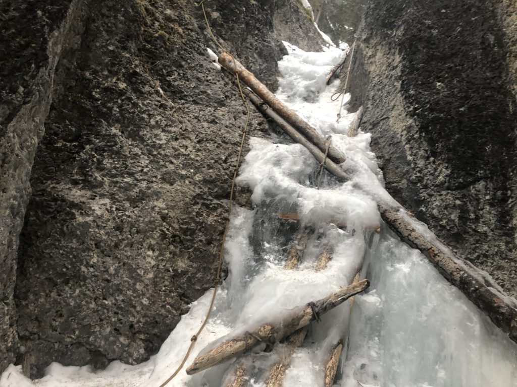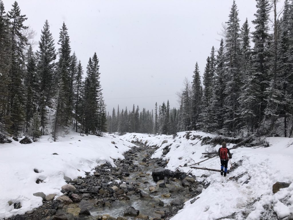 Maybe the other side of the continental divide received more snowfall than Canmore, and the trail is buried. We crossed the road and made our way to the Marble Canyon Campground. As we crossed the bridge, it had knee-deep snow.