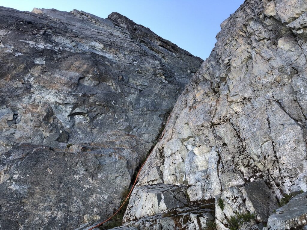We could see the chimney mentioned in the guidebook from the top of the second pitch. Initially, we thought about setting up an anchor to the left of the chimney, but considering the rope drag, we decided to position ourselves right below the chimney. We also talked about the potential of rock fall in the chimney.