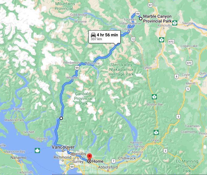 The challenge is the long drive, especially if you are planning to make a day trip. It is about 340 km drive one-way from my home to Marble Canyon. It takes about four hours if I go via Hope and five hours if I drive through Whistler. Since I was carpooling with Slawomir and Beata, we took the Whistler route. After all this driving, there is another 1600 km of driving to get to the BC-Yukon border.