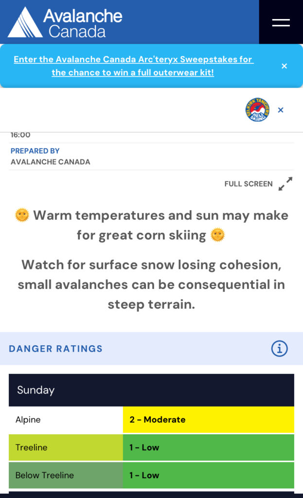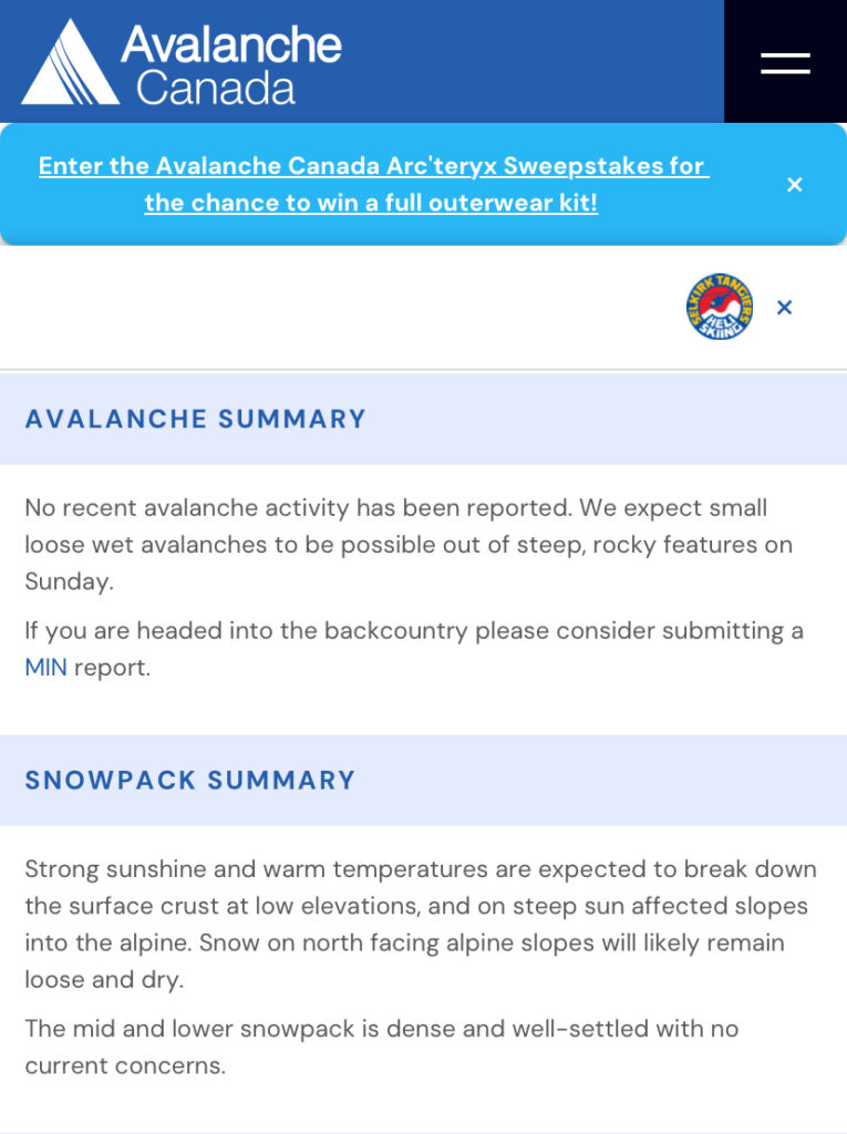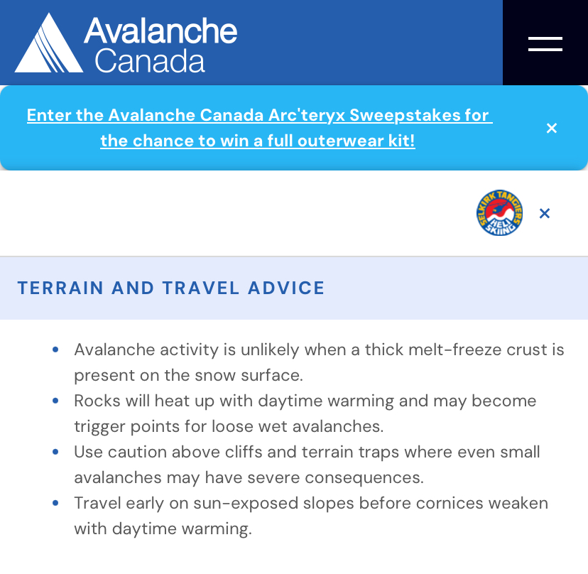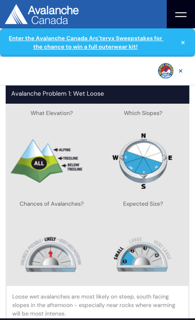 The avy forecast from Avalanche Canada was Moderate/Low/Low. The main concern was the small, loose, wet avalanches on steep south-facing slopes, especially with warmer temperatures in the afternoon.