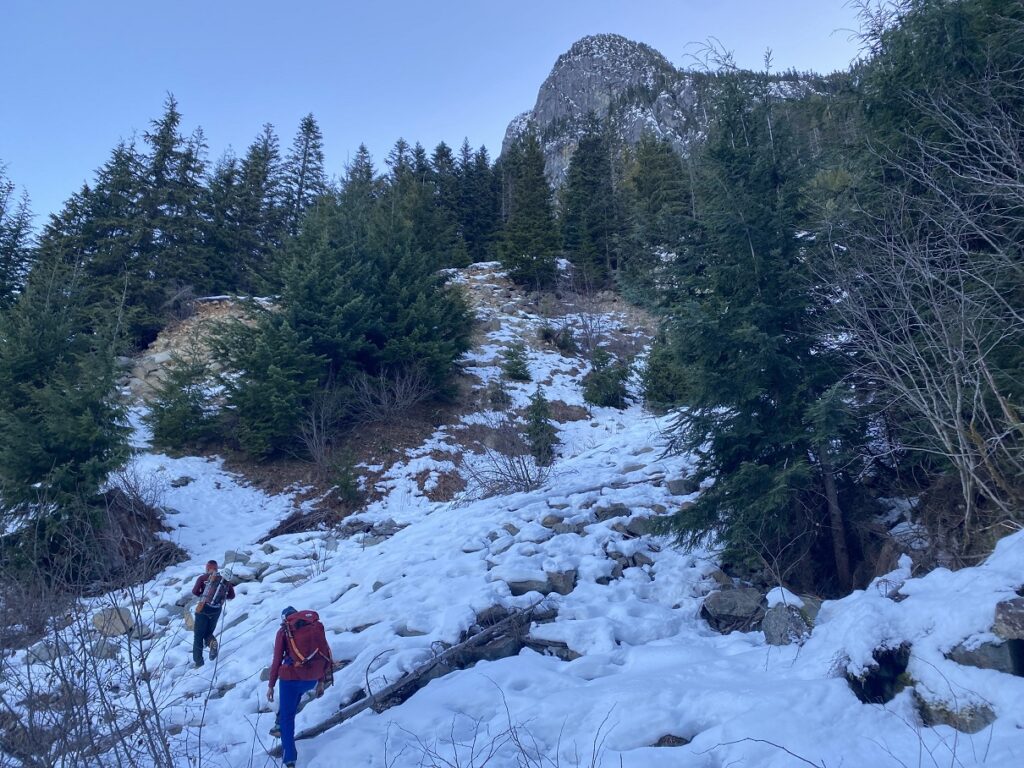We finished the traverse and climbed up to another plateau. It was sunny and warm. We could see a trail straight up (North side of Harvey) that some climbers had taken but decided to take the other trail traversing to Harvey’s Northeast side. Soon, we were breaking the trail as we climbed up the slopes and made our way around the trees.