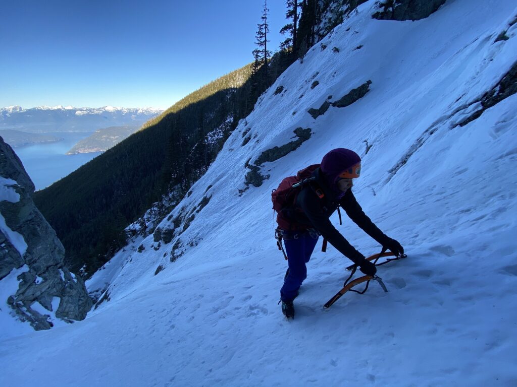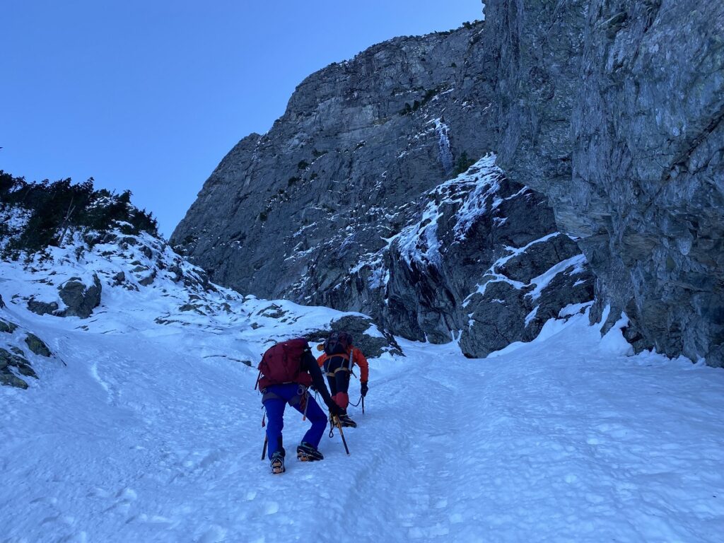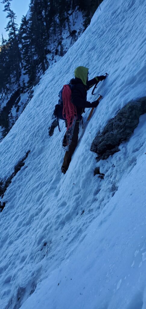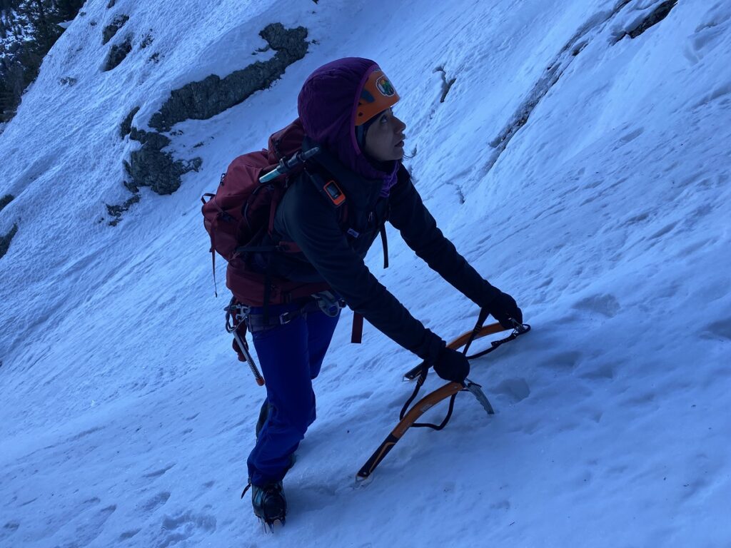 But as we started from the base of the ramp, the climb seemed much more manageable. The initial section was easy enough to use the French (flat foot) technique and, at times, the American (Hybrid—one flat, one front point) technique with an ice axe/tool in a cane position.