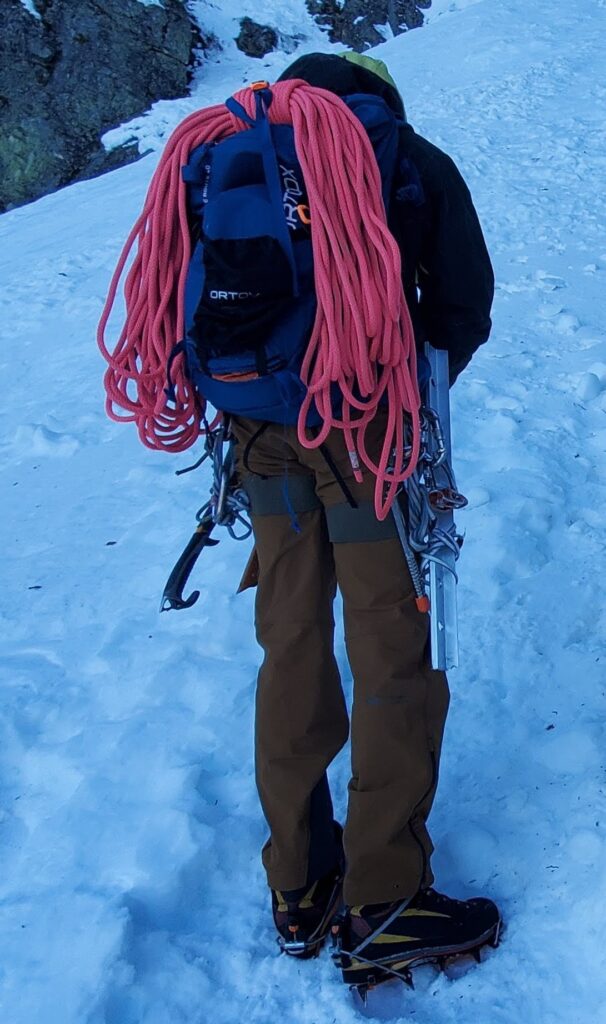 - Personal gear (helmet, harness, 120 cm slings, anchor material, locking carabiners, two ice tools/axe, crampons, microspikes)