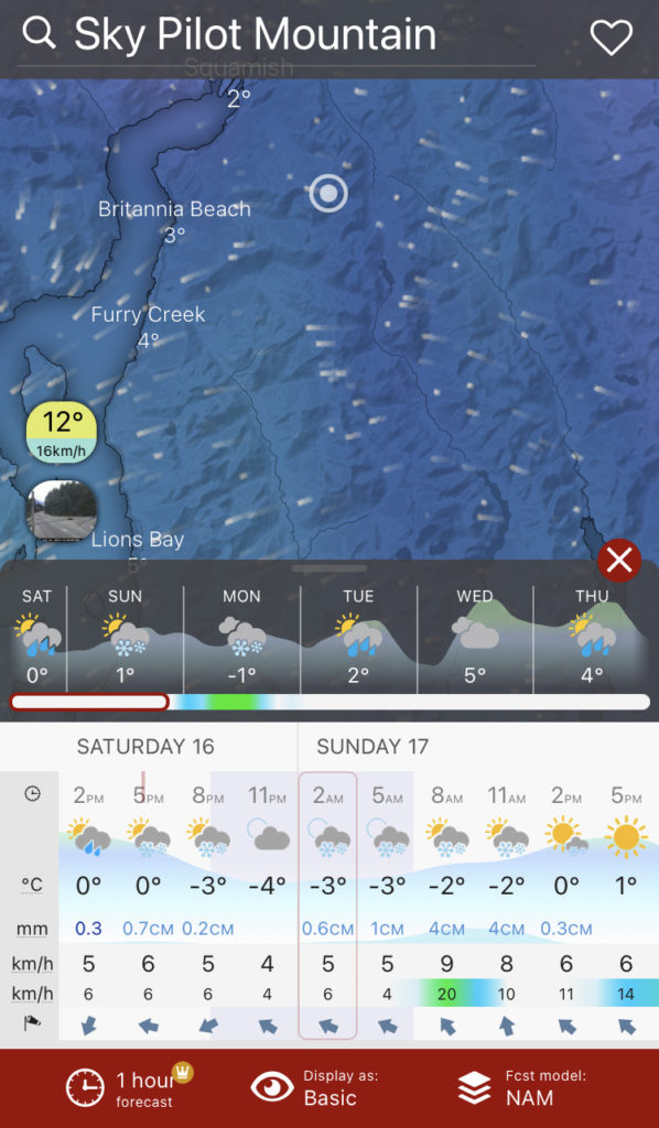 The next day, the updated avalanche forecast for Sunday was Low/Low/Low. Most models forecasted a good weather window for Sunday, except for the NAM model on Windy.