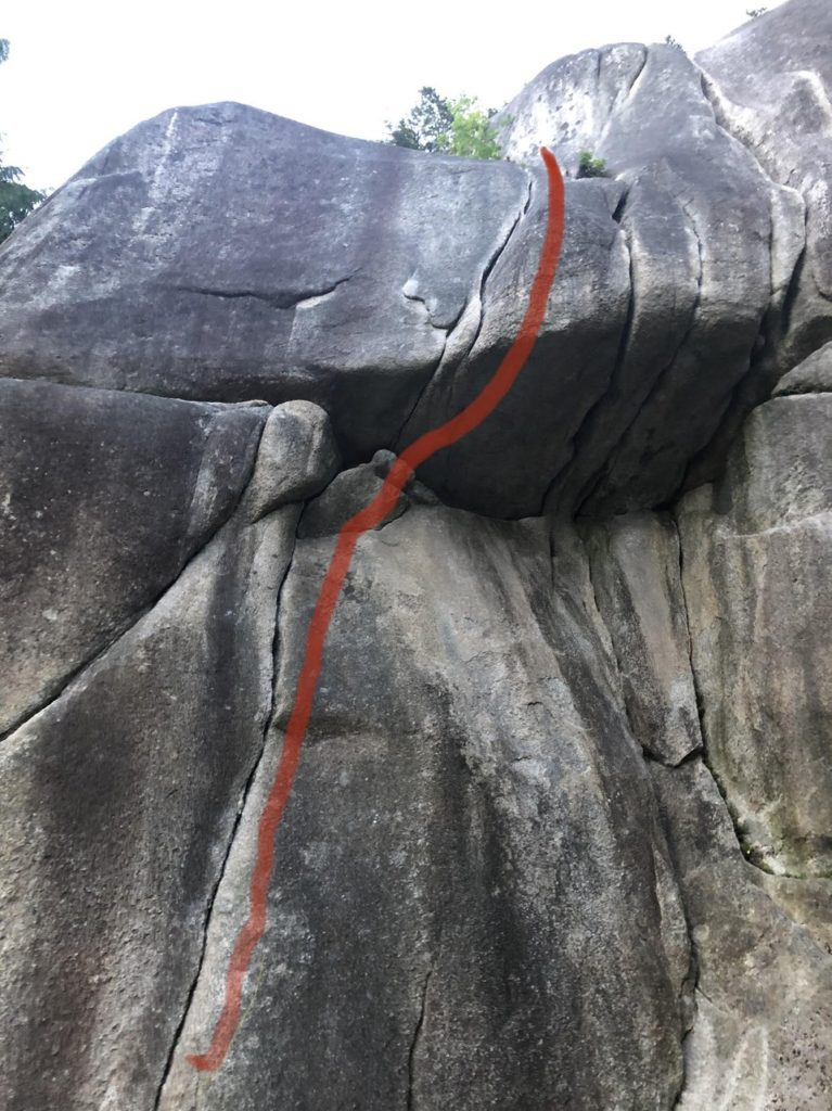 Just below the roof, I put three pieces in – two in the horizontal crack and one on the roof. Knowing that I was secured, I was mentally prepared for the crux move. I had my right hand in the crack above the roof and it felt solid. After a few grunts, I got myself on the face above and finished the route. This one felt like a solid 5.10a.
