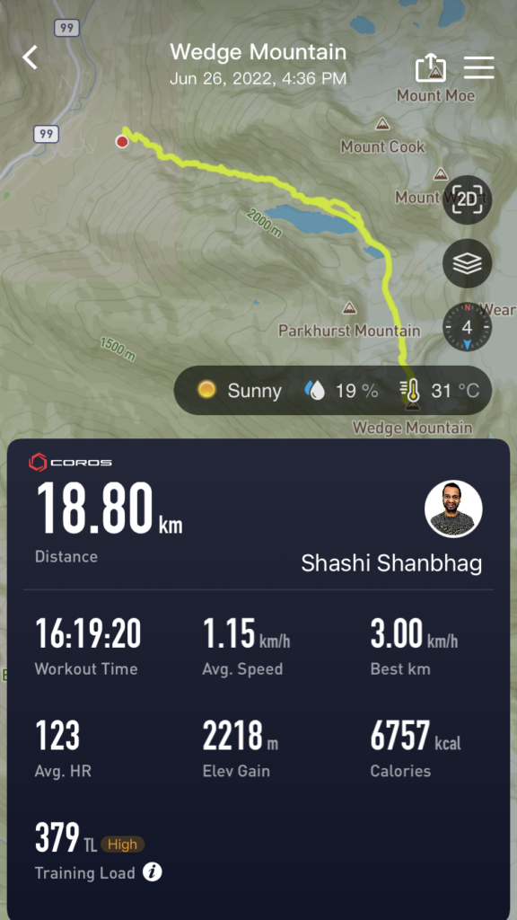 After tracking the weather for most of June and cancelling a couple of plans, I was not sure if I would be able to make any alpine trips this month. Fortunately, a high-pressure system was developing, and the weekend of June 25-26 looked promising. Both Rohan and I had planned for family camping the same weekend. Rohan suggested we take a day off on June 27 and attempt Wedge Mountain (2903 m) via the North East Arete route. Given the forecast, I agreed. It would be my third attempt on Wedge.