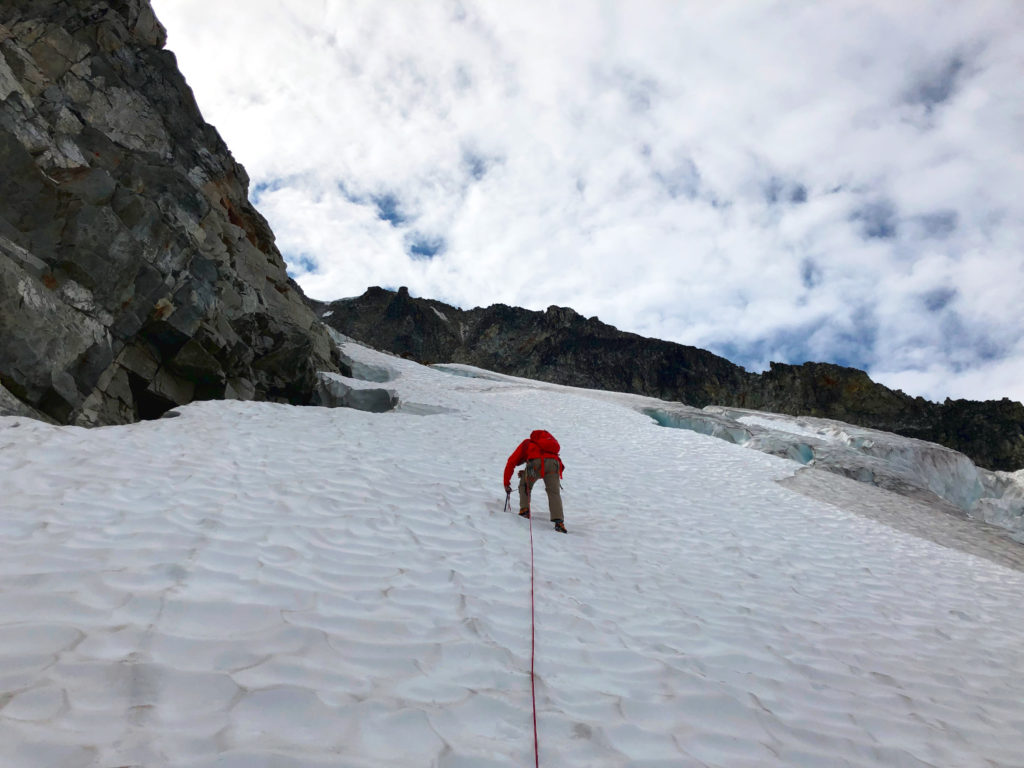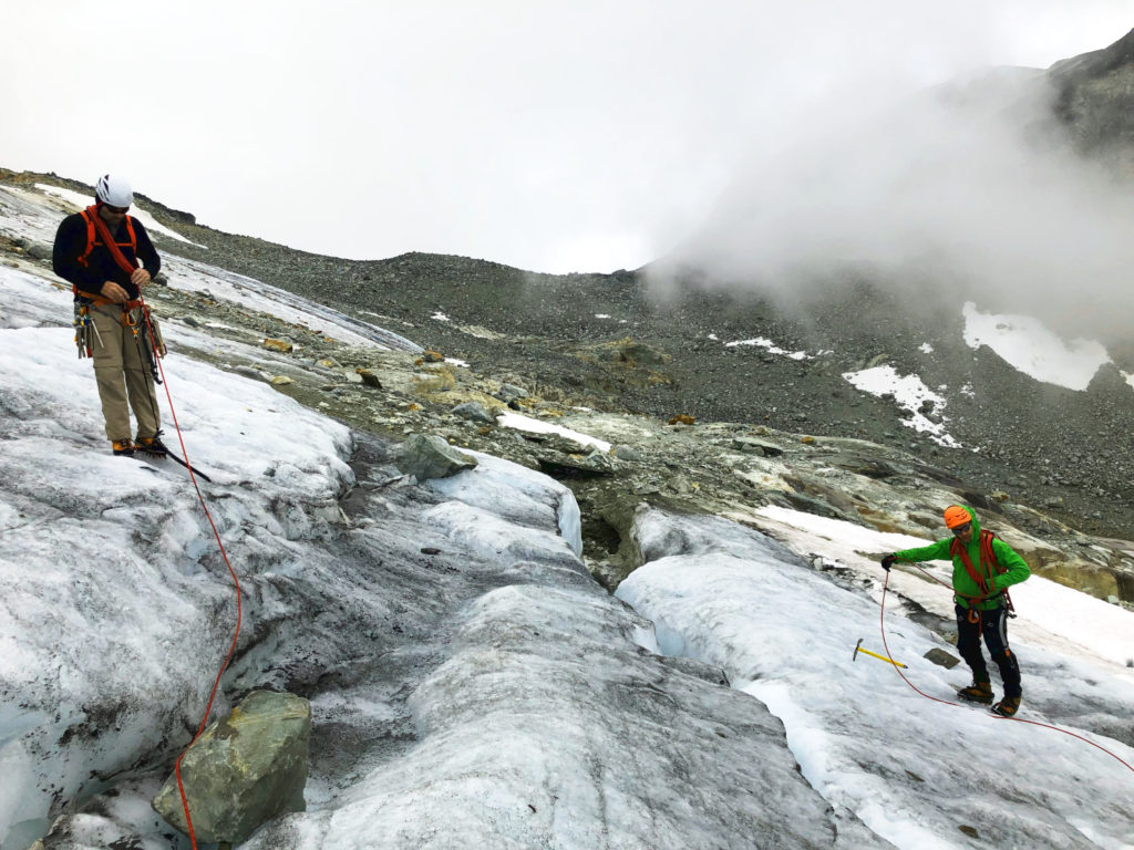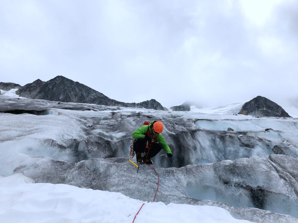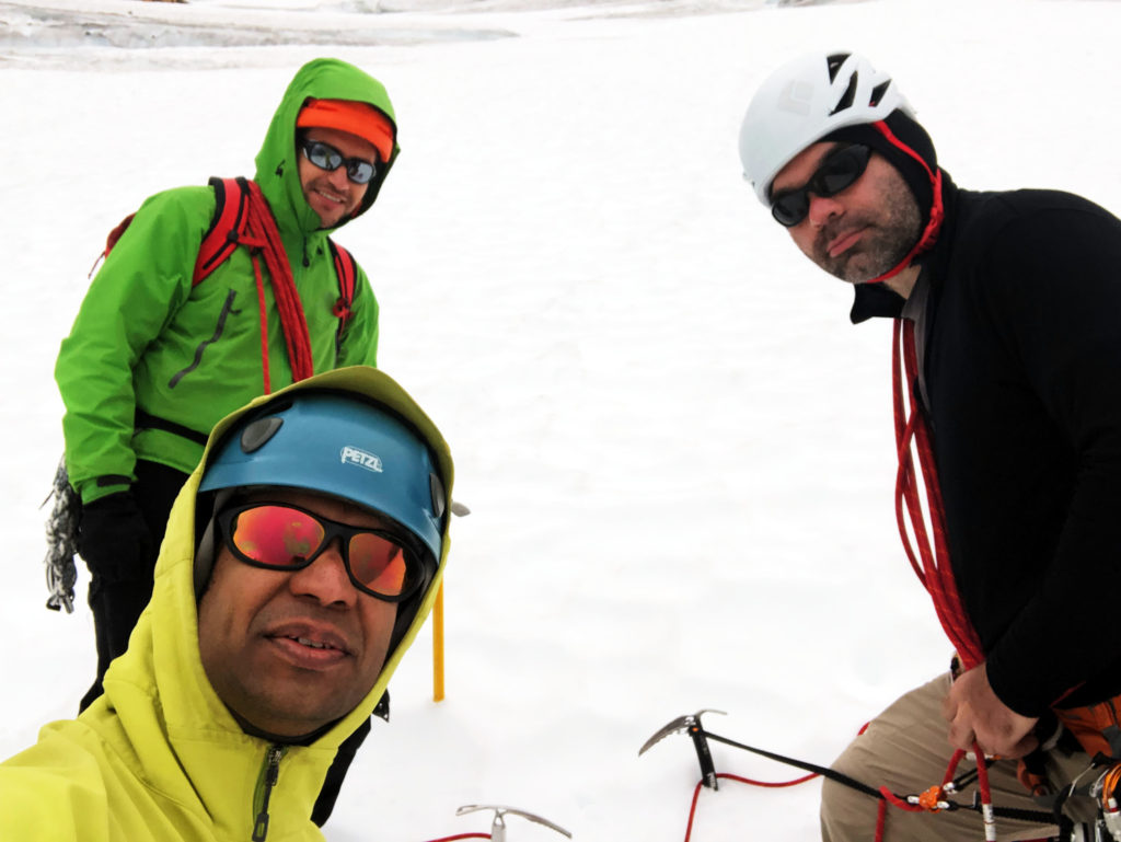 It was a slow descent – managing rope, navigating crevasses and protecting with ice screws at some places.