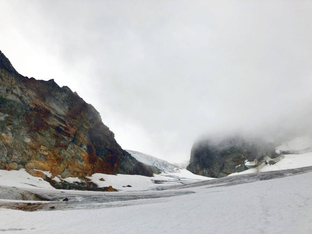 For the next few hours, we hiked through the maze of crevasses to reach Parkhurst-Wedge Col. Intermittently, the clouds would clear up, giving us a clear view of the Wedge mountain.