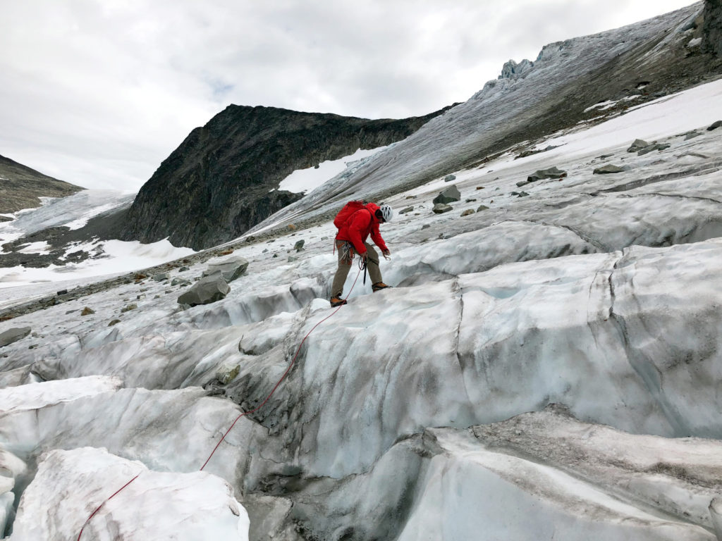 On the Northside, there seemed a way to get higher up on the mountain. To access this route, we would have to get back down on the glacier and make a traverse to avoid the rockfall hazards.