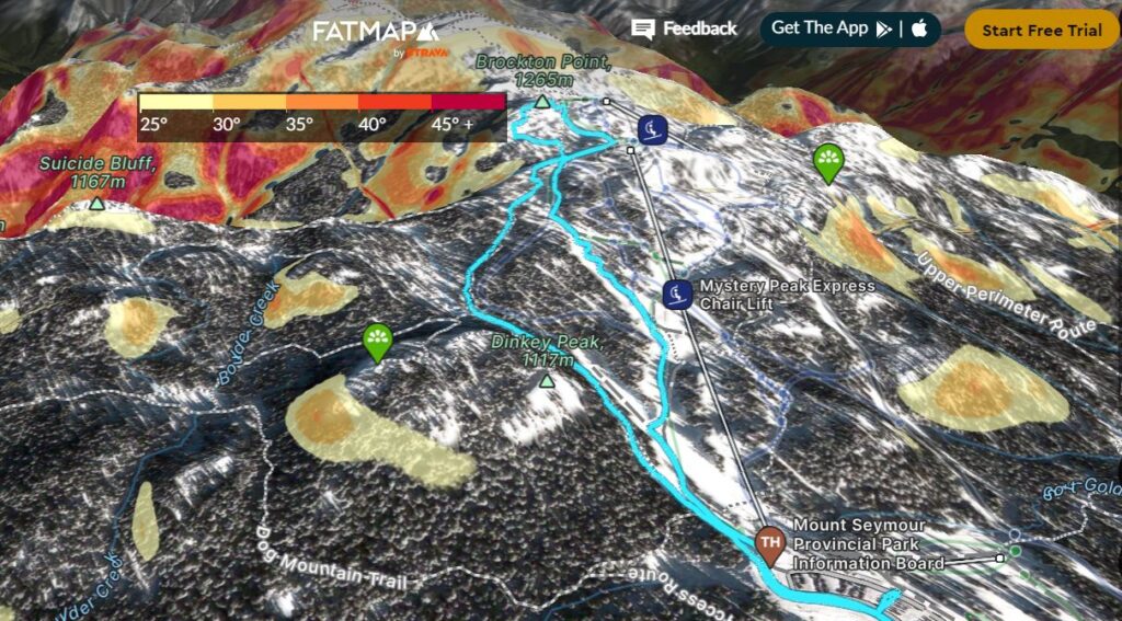 Our route to Brockton Point on FATMAP with an overlay of Avalanche Terrain –