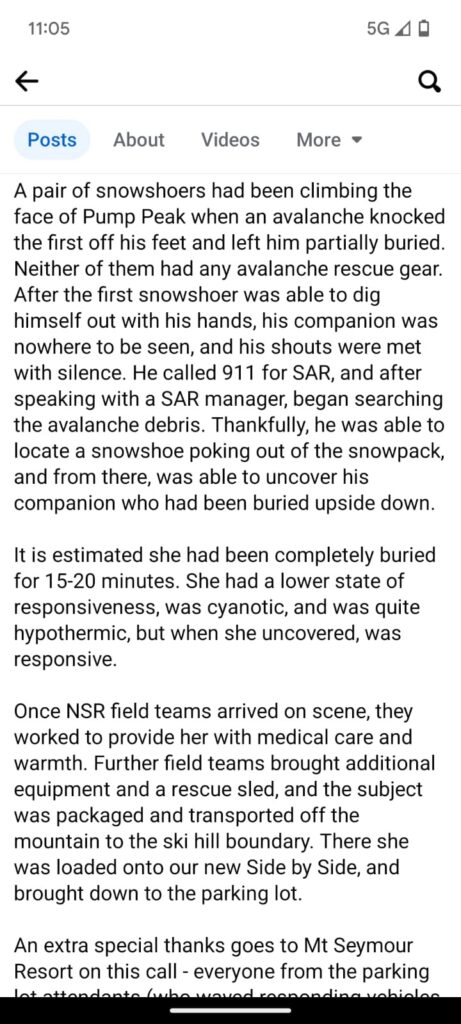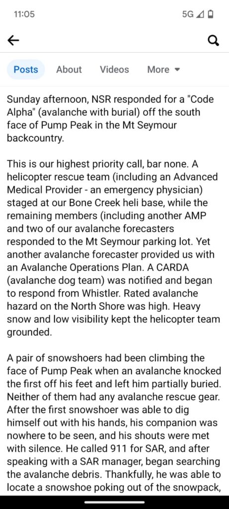 I had been to Pump Peak in the past, but the avalanche hazards were too high, so we had planned to visit just Brockton Point today. The next day, a friend shared the North Shore Rescue Facebook post about a snowshoer who triggered an avalanche on South Face of Pump Peak. She was buried for 15 minutes but luckily, she survived.
