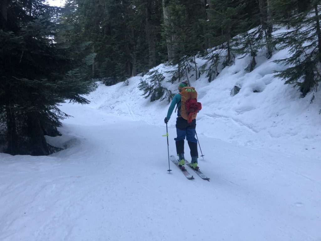 It was hard-packed snow on the trail, and although I didn’t have issues skinning up, I wondered about skiing down this trail. If I don’t have my act together, I might turn this into a bowling alley – taking down skiers and hikers on their way up.