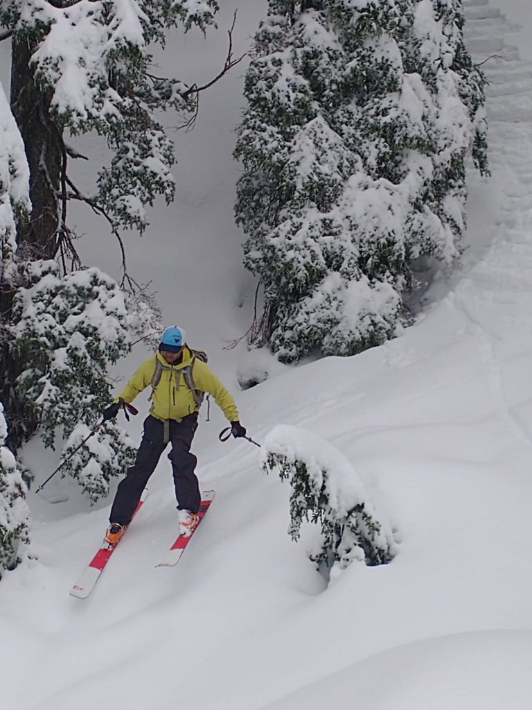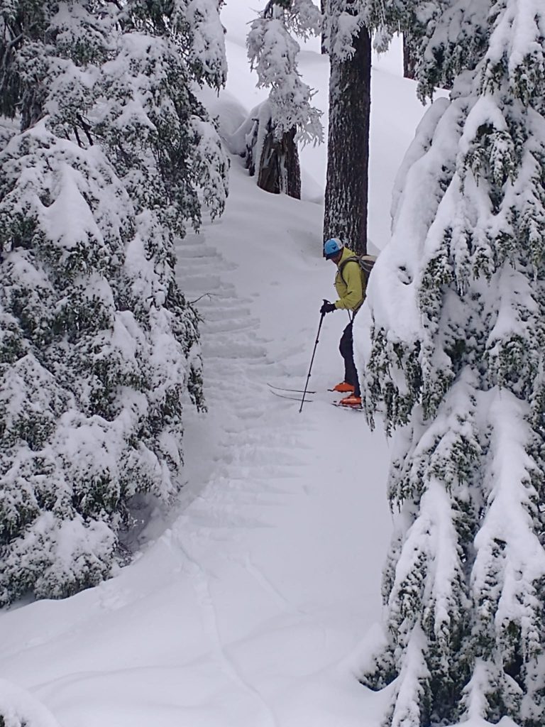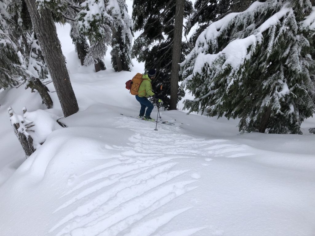 I sometimes found myself in steep terrain where sidestepping uphill was a better option. It was good practice for me as we got to do this a couple of times. Finally, we were on the Suicide Bluff Route. We transitioned back to ski mode. Based on the map, what we thought would be an easy slope ahead turned out to be a steep section (at least for me).