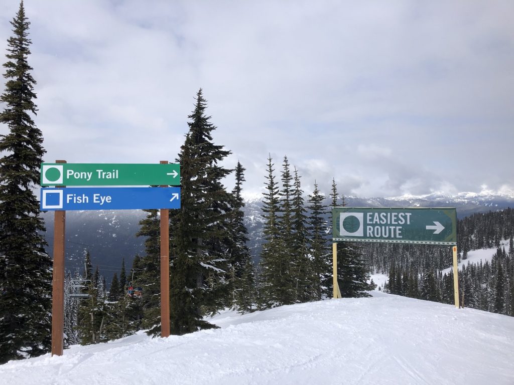 It was almost 1 pm by the time we got to the top of Big Red Express at about 1862 m. From here, you can do a short ski to the Roundhouse Lodge, take the Peak 2 Peak Gondola and explore runs on the Blackcomb mountain. But the lifts close at 3:30 pm, so we decided to explore runs just on the Whistler Creekside, given the limited time.