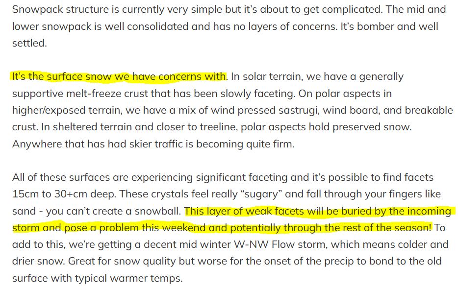 The two avalanche problems shared in the forecast were Storm Slab and Dry Loose. On Jan 30, I hosted Eric Carter on BCMC’s first Speaker Series as part of the Mentorship and Training Program, and he raised similar concerns when asked about weekend conditions. He reiterated these concerns in the weekly Zenith Guides Snow Newsletter. Here is a snapshot from the report –