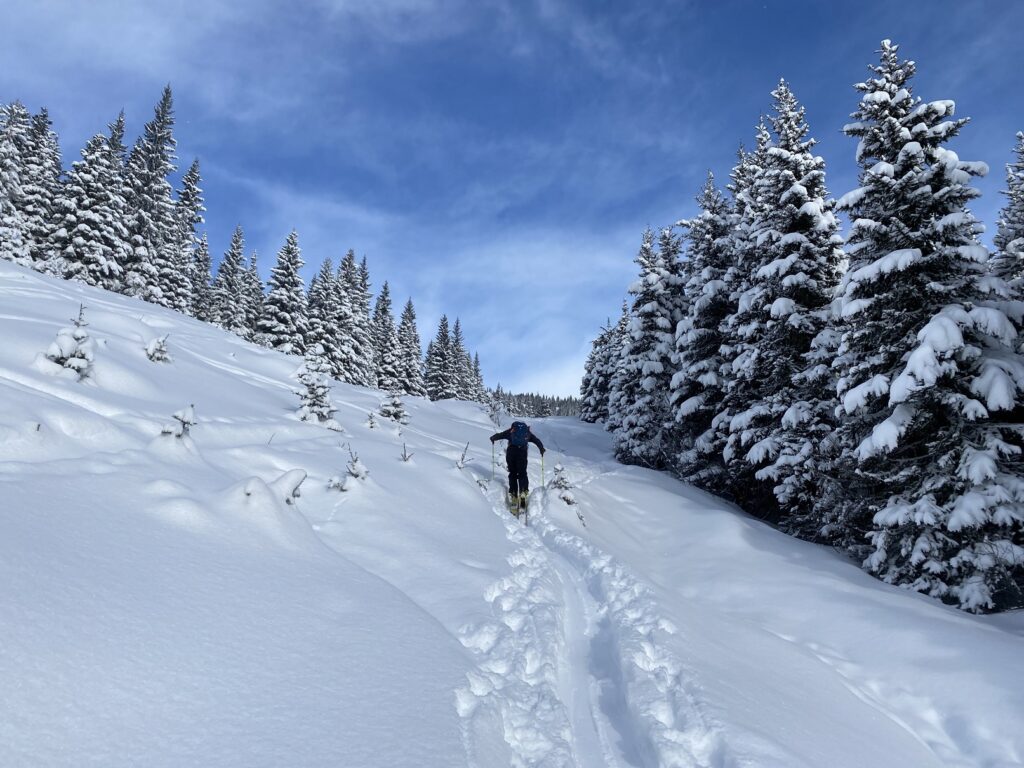 It was a gradual climb through the forest, and fresh snow made for easy travel. It took us about 30 minutes or less to clear the forest and get on the ridge with sparse trees.
