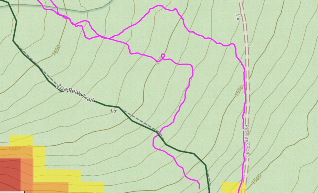 I couldn’t see or hear Oudi. After waiting for a few minutes, I checked the map on GAIA and started heading towards the Zoa Peak Trail. I saw tracks and orange trail markers, but unfortunately, it was the summer trail and not an easy terrain (tight trees and steep) to ski down.