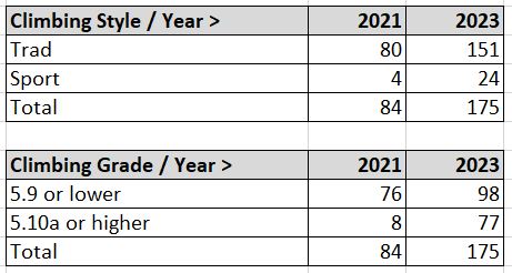 But still, I had a great season and did around 175 climbs, with 44% of these climbs 5.10a or higher. I wrote a detailed post on improving my trad climbing grade, and you can read it here.