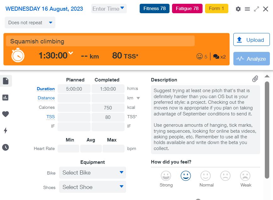 There are more reds (missed workouts) this week than I would like. However, on Wed and Sun, I climbed in Squamish, so I didn’t have to do the alternate workouts. Mon and Thu, I guess I just decided to take it easy.