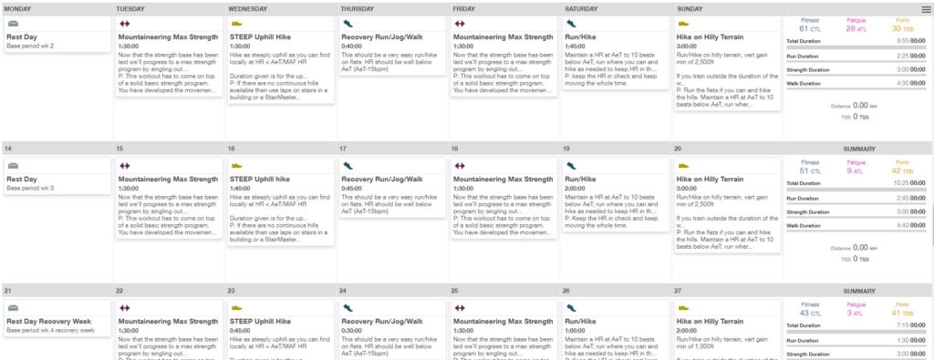 Considering I had minimal training background and likely limited aerobic capacity, Scott recommended the 24-week Mountaineering Plan. He also suggested that I should start with a lower training volume relative to what was given in the plan.