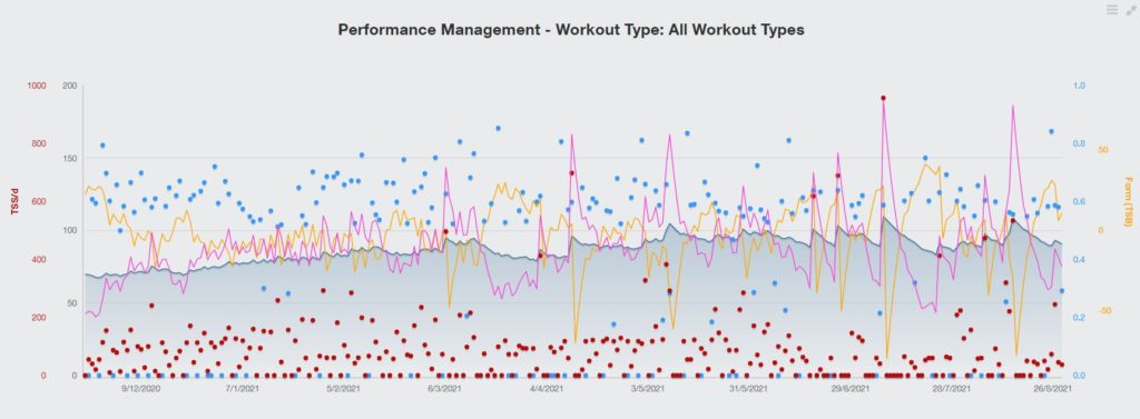 - Grey – Unplanned workouts (completed values with no planned values)