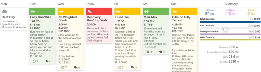 After eight weeks of the Base period, I was ready to do some mountaineering-specific training. Here is a sample week from this period –