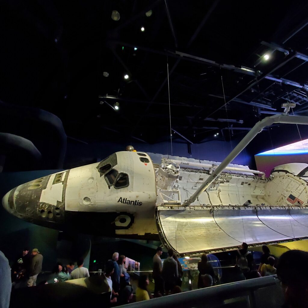 Our final stop was at the Space Shuttle Atlantis – which has a full-scale space shuttle stack of two solid rocket boosters and an orange external tank at the entrance.