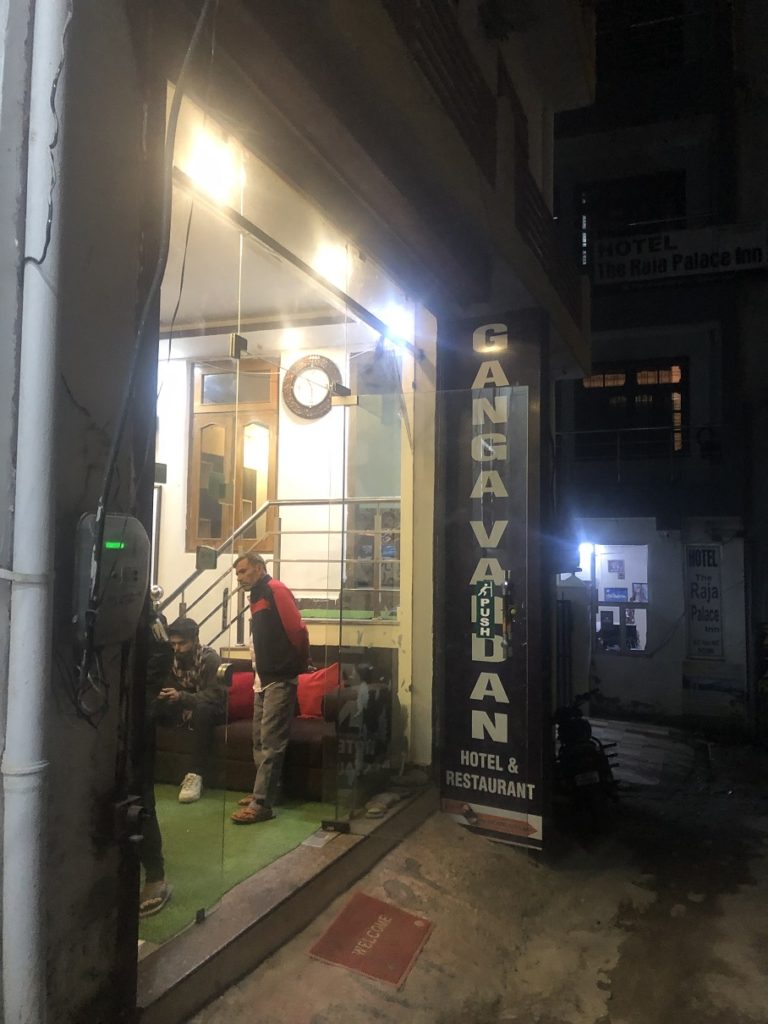 The cab dropped us off in Tapovan, and we walked to what we thought was the hostel’s location. But we didn’t see any signs for the hostel. Kundan walked into a lodge to inquire. To our surprise, the front desk guy said we were actually at Wanderlove hostel.