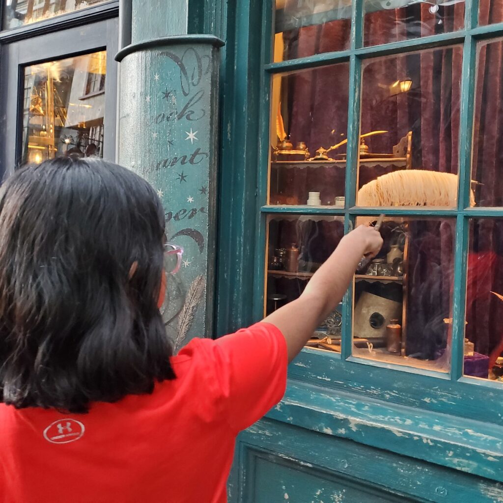 Places like Ollivander’s Shop, Weasley’s Wizard Wheezes, Borgin & Burkes, etc., were some of the highlights for us at Diagon Alley. The interactive wand spots were also unique and took more effort than the ones at Hogsmeade.