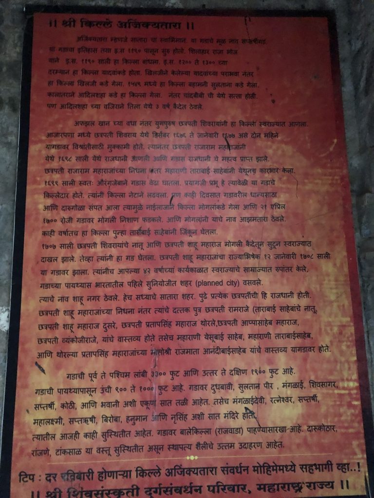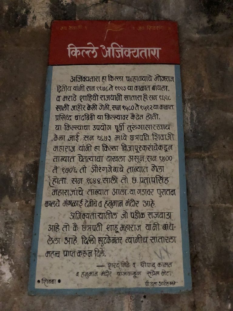 Right at the western entrance, there are two boards with history and information about the fort. Ajinkyatara was built around the late 12th century by Bhojraj II. Over the centuries, Yadavas, Khilji, Bahamani, Adilshahi, Marathas and Mughals ruled on this fort and it has a rich history.