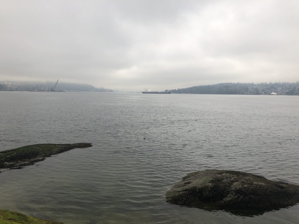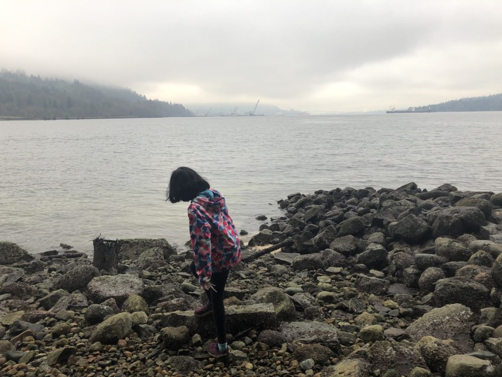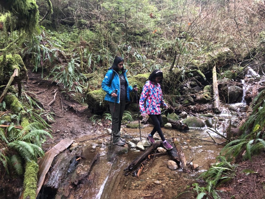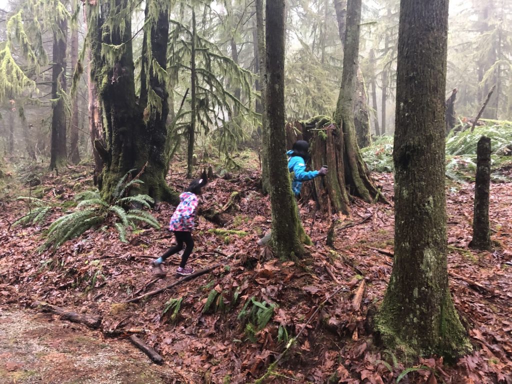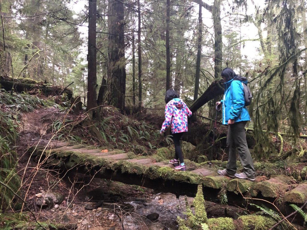 About an hour into the hike, we reached Belcarra Bluffs. But it was foggy, and we couldn’t see much beyond the bluffs. Nevertheless, Kavya was still in good spirits as we had a quick snack break, and she knew it was all downhill from here. Almost.