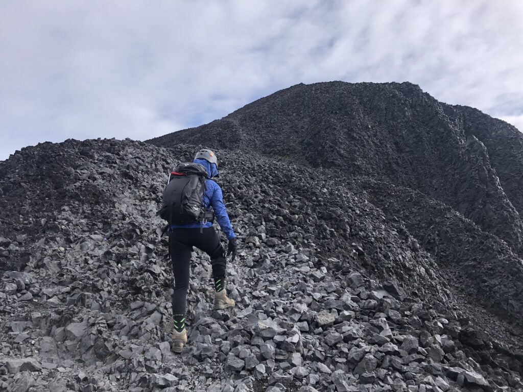 The route up might not be obvious at times, but the flagging (pink, purple ribbons) helps to stay on track. It is a Class 3 scramble over loose rocks.