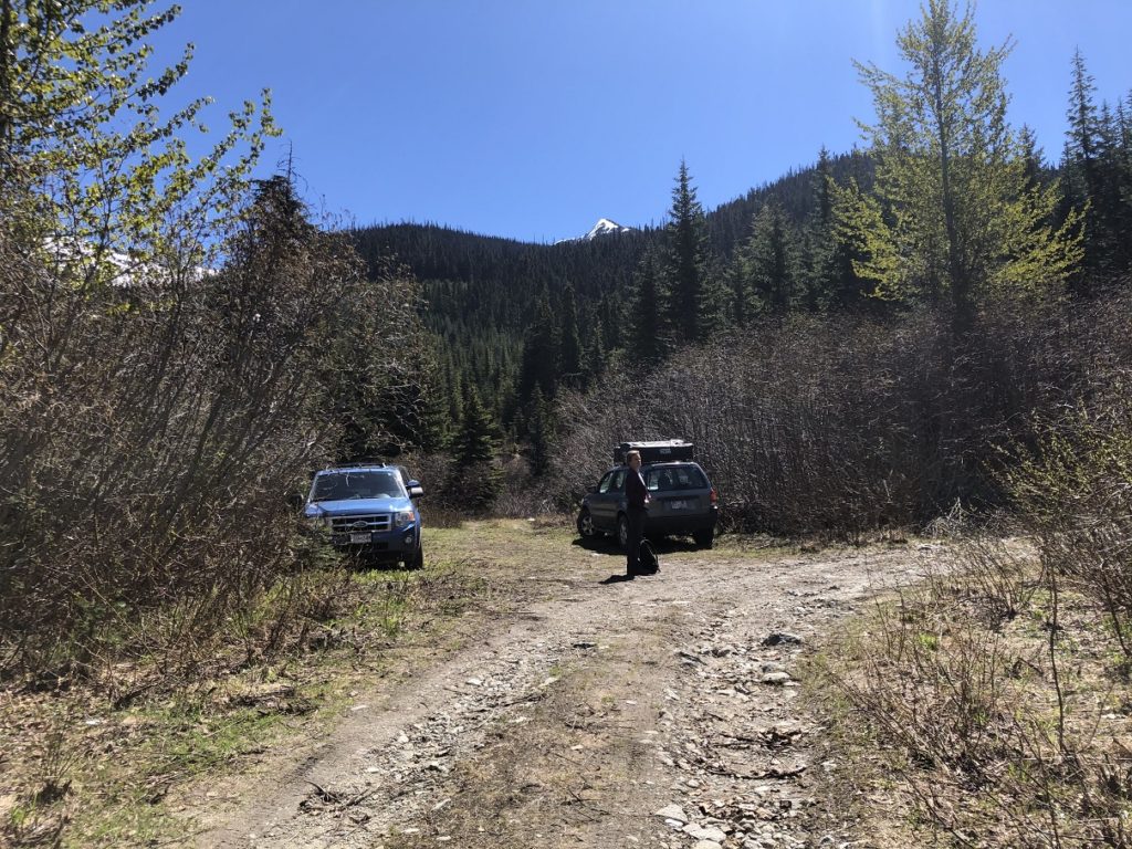 It was clear of snow but was muddy in some sections. We continued on the FSR for about 2.7 km or 40 minutes and arrived at a junction. A few cars/pick-up trucks were parked here.