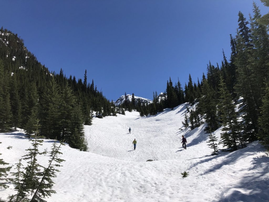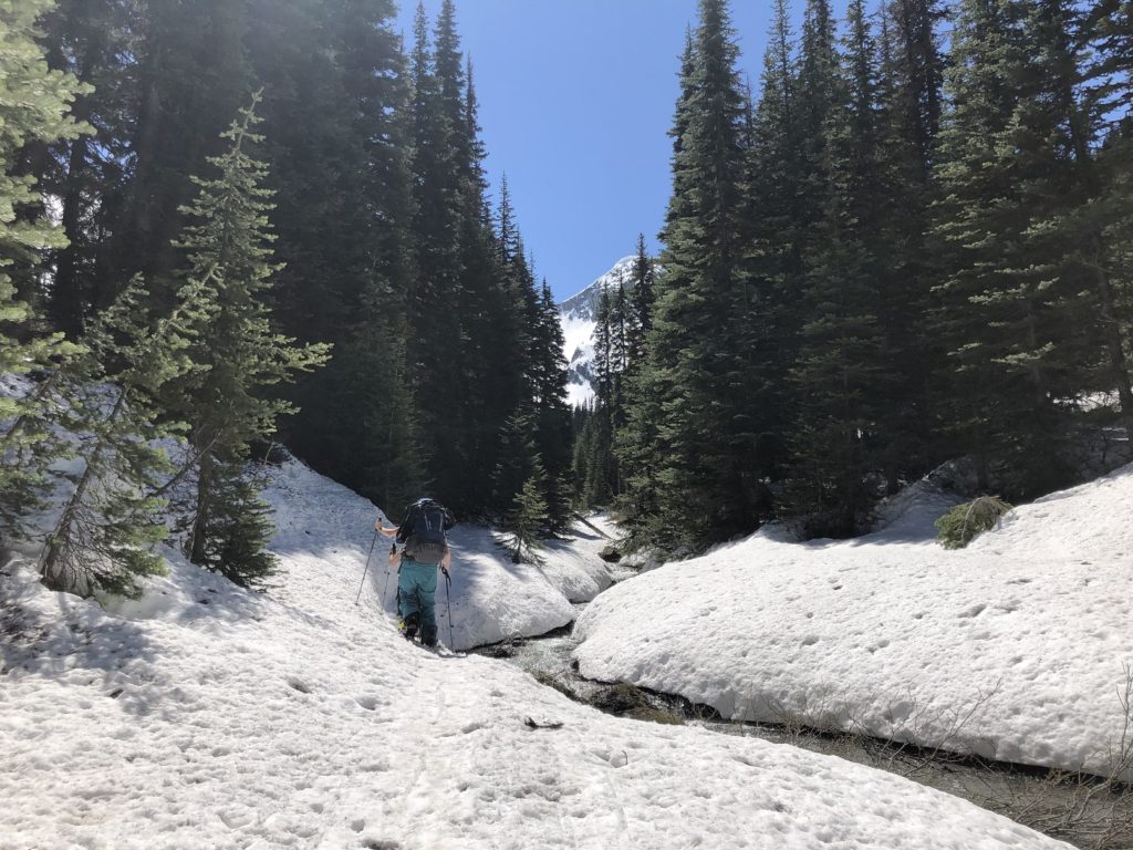 From here, we left the FSR and continued along Steep Creek. The ski tracks made it easy for us to follow the trail. Eventually, we caught up with the skiers.