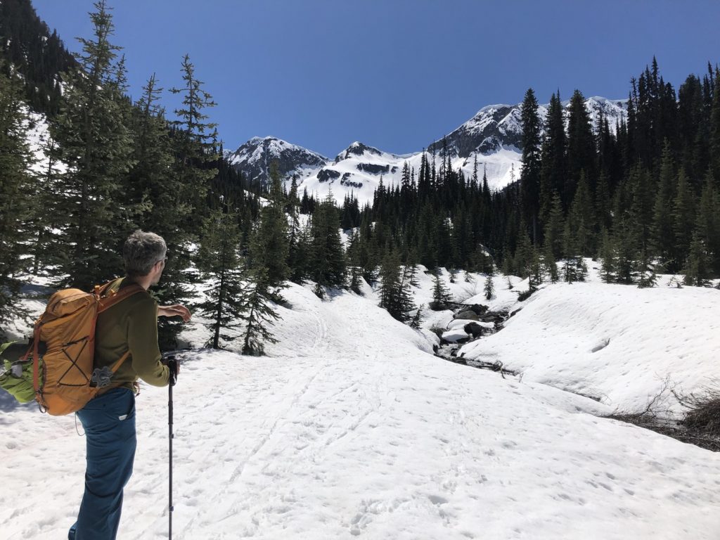 In total it was about a 12 km hike with 635 m vertical. With a 25 lb. backpack it was a good workout. I hope to come back here in good conditions to climb Steep Peak and maybe even ski down it someday.