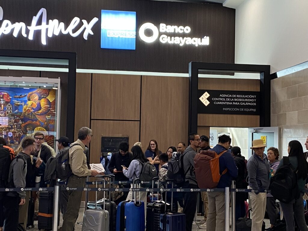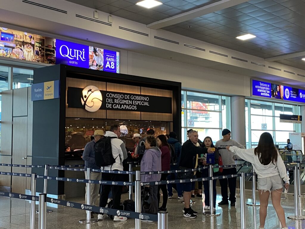 Two days later, when we returned to the airport for our flight to San Cristobal, I was glad we had picked up our TCT cards earlier, as there was a lineup at the counter. Visitors must obtain these cards before proceeding to the special baggage check for the Galapagos. There was a lineup for baggage check as well, and it took us about 30 minutes or so to get through.