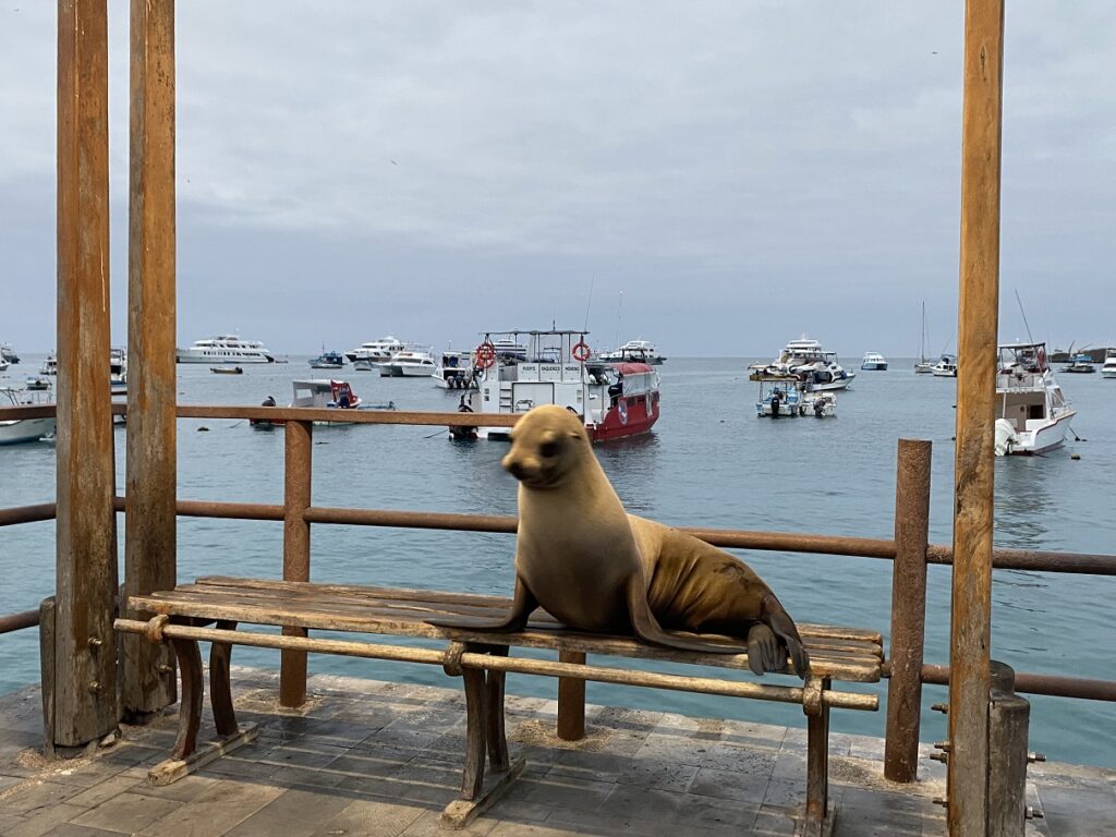 Our hostel was a couple of blocks from the main street with all the restaurants, cafes, a small beach (Playa de Oro) and the main dock. Later in the evening, we went down to the main street for a walk and had our first view of the sea lions. Sea Lions that I have been reading about in the blogs that just relax on the dock benches, stairs, boardwalk or on the beach.
