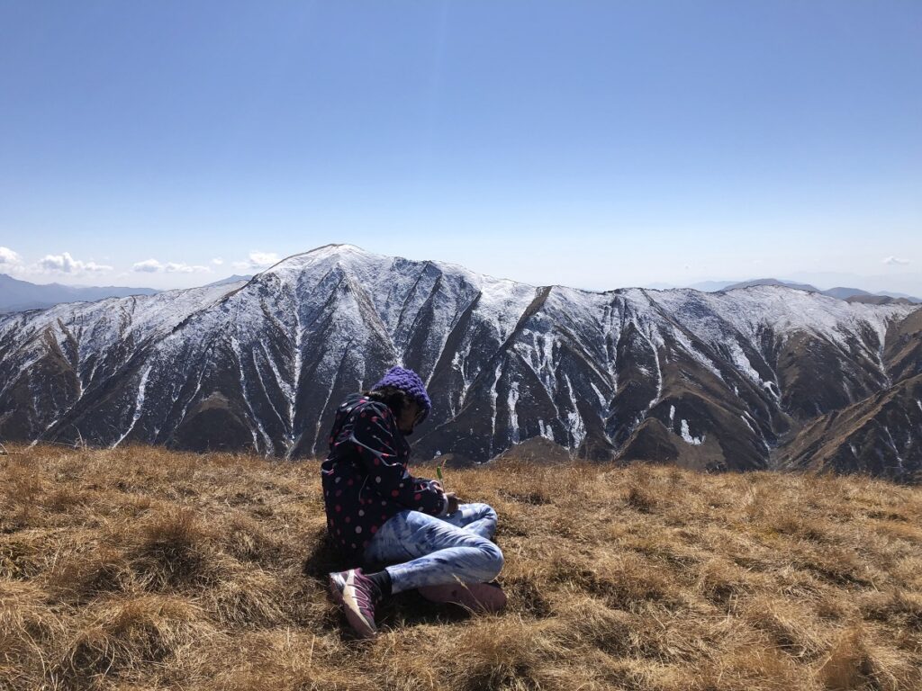 Kavya near Gidara Bugyal Top. Gangotri Mountain Range in the background