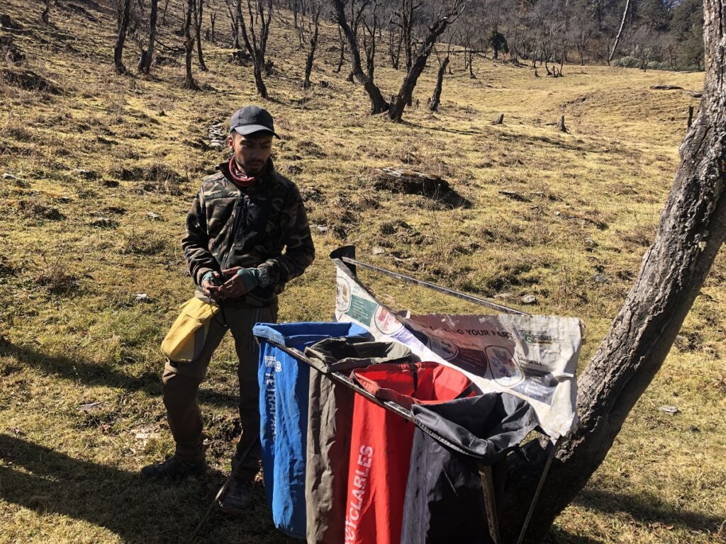 After breakfast, we had a cleanup effort to collect trash at the Dhokrani campsite, mainly around the stream. We found all kinds of garbage and filled a couple of trash bags.