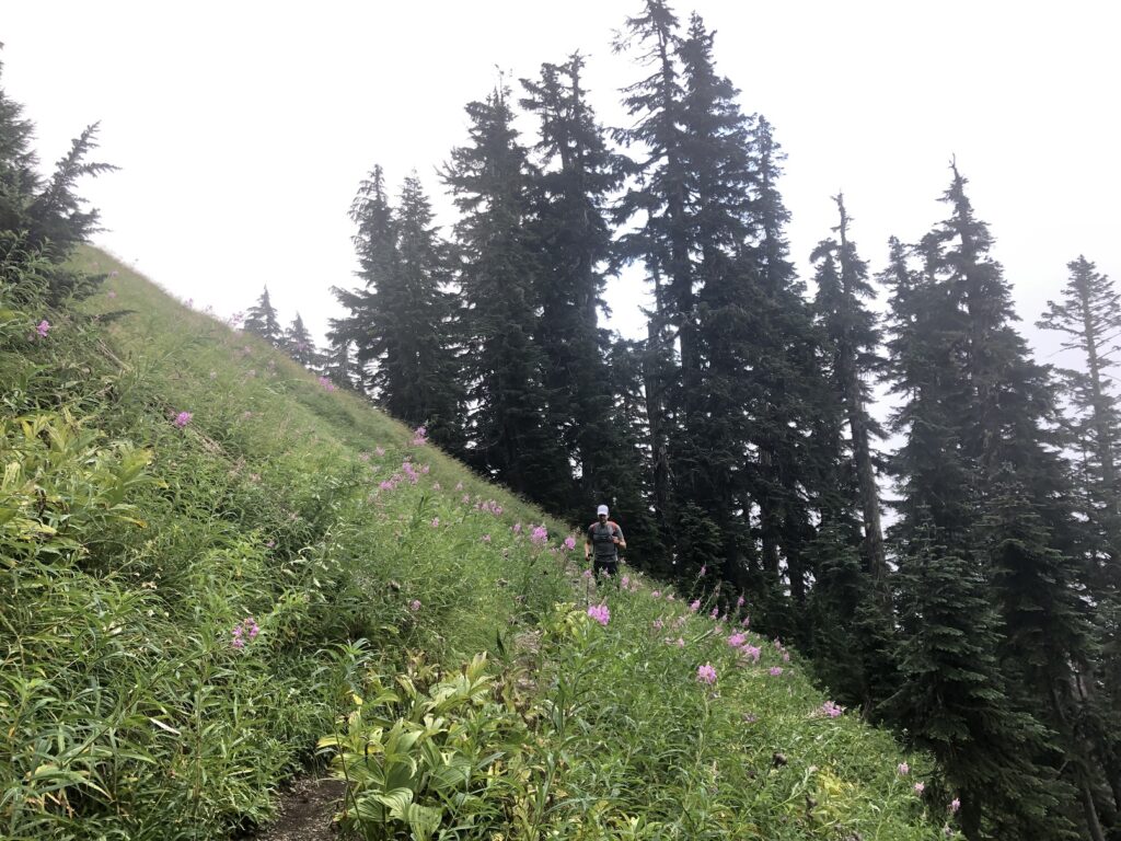 The views were limited due to clouds, but as we dropped down from the North Peak of Unnecessary Mountain, we had a good view of the trail leading to West Lion.