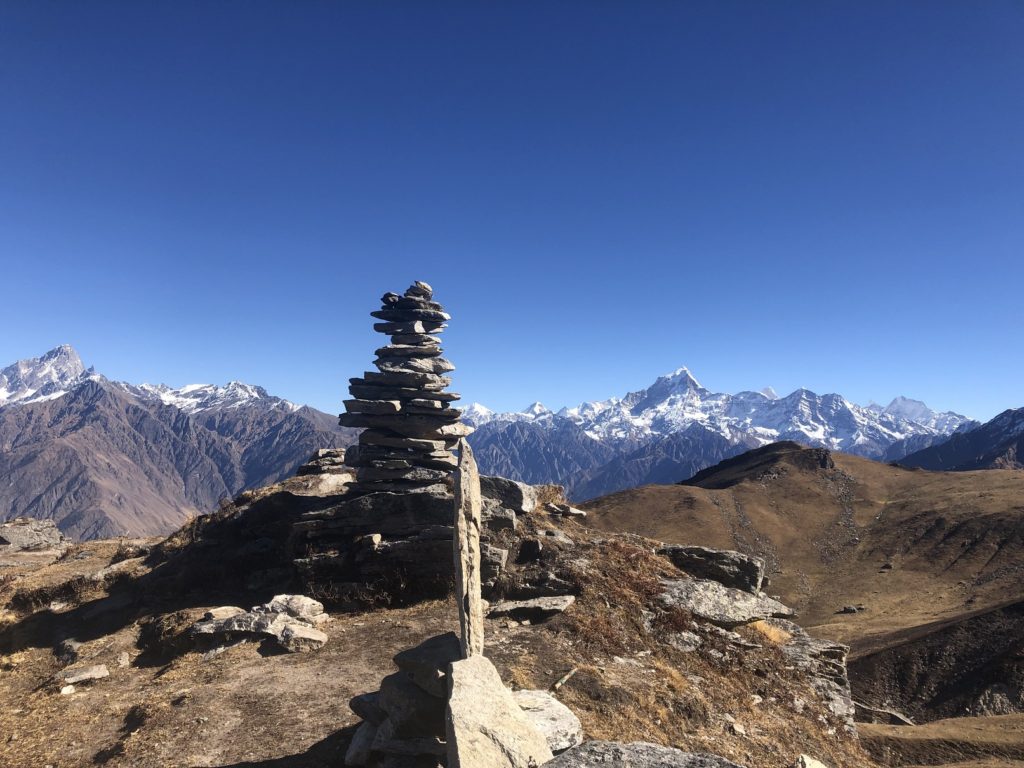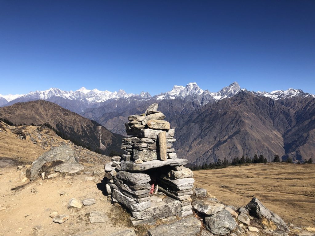 Finally, at 10:45 am, four and half hours since I started the hike from Karchi, I was at the Kuari Pass high point at 3850 m. I got lucky with the weather and got some fantastic views of the prominent peaks like Chaukhamba, Hathi Peak, Gauri, Donagiri, Neelkanth, Kamet, etc. in the Garhwal Himalayas. Check out this post by India Hikes that highlights some of these peaks.