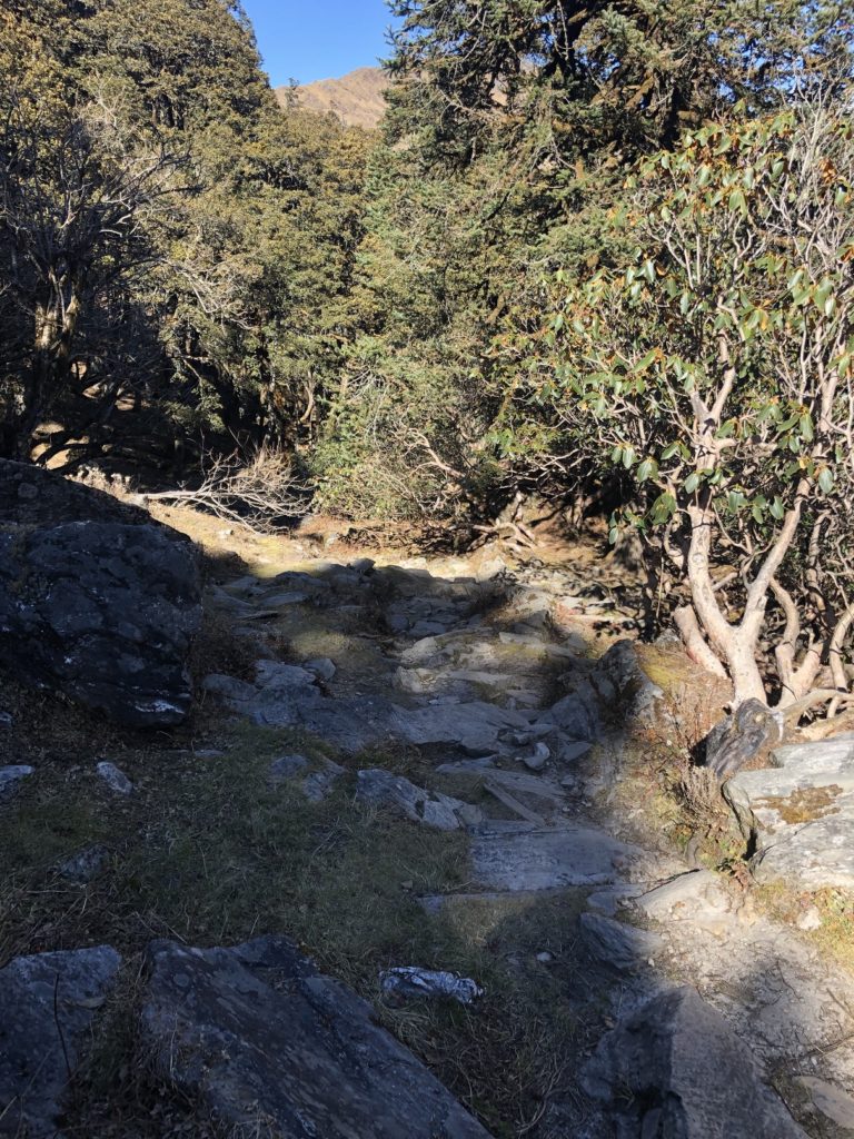 After a brief chat with the India Hikes local staff at the Tali campsite, I continued my hike to Auli. I knew it was a long hike (about eight km) to Auli, but what caught me by surprise was the terrain. From Tali, I expected the trail would have a steady elevation drop, but it didn’t.
