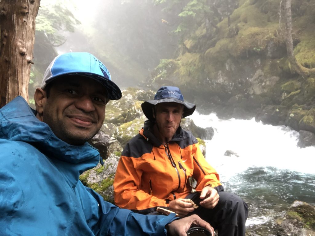 It was rainy and windy at the lake, so we got back on the trail, changed into some dry clothes and started our hike down. It was close to 1 pm, and we wanted to be down in time to cross the river in the canoe.
