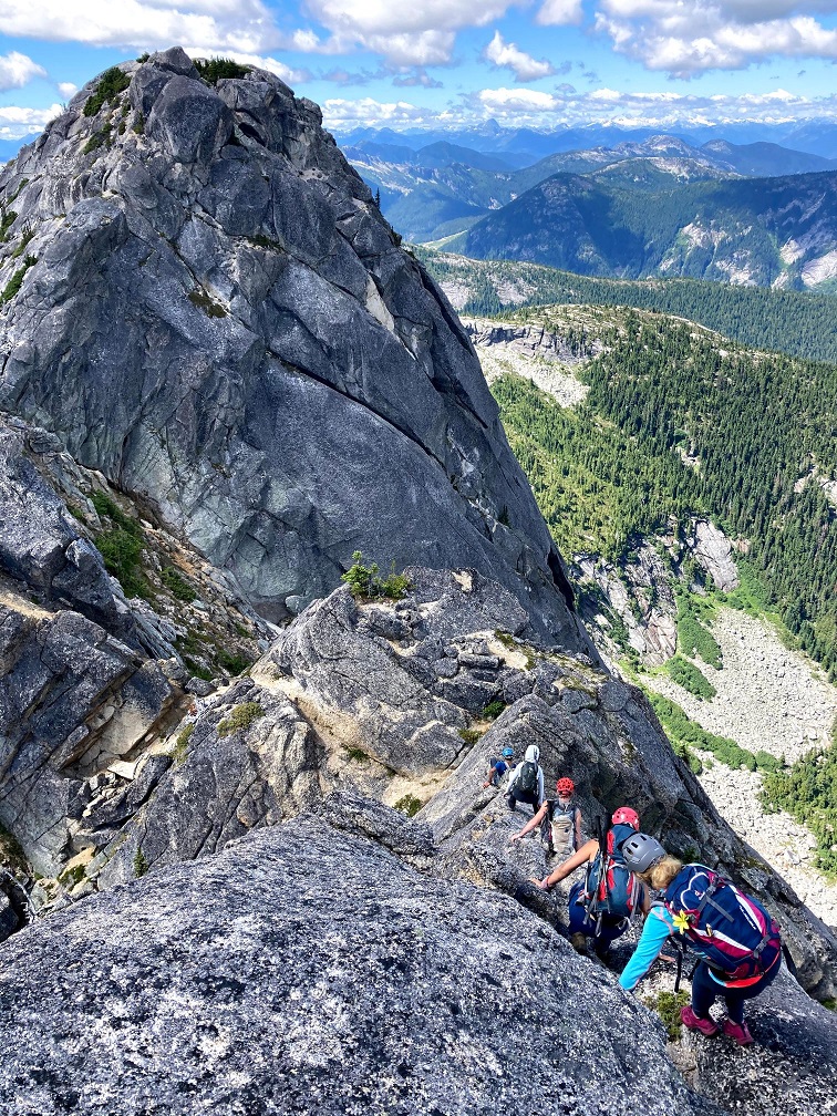 The rest of the group followed, and Wayne helped a couple of them find their footing as they down climbed to the base of the exposed ridge.
