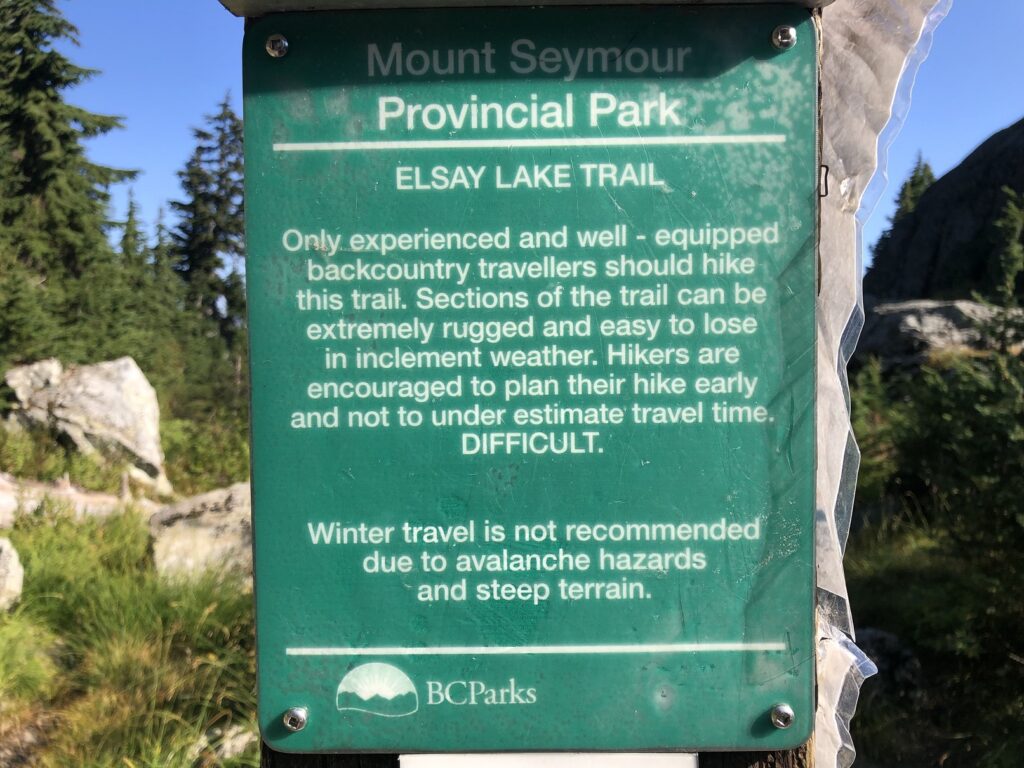 It was an early start for us, and started the hike at 5:30 am from the parking in front of the Enquist Lodge (Mt. Seymour Snow Tubing area). We took the Mount Seymour Trail, and about an hour and ten minutes into the hike, we were at the intersection of the Mount Seymour and Elsay Lake Trail.