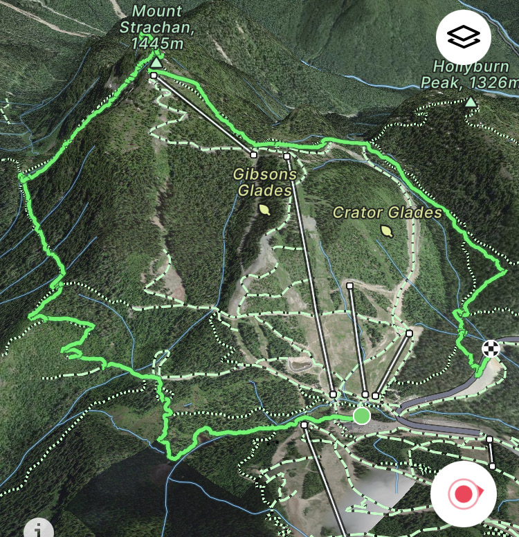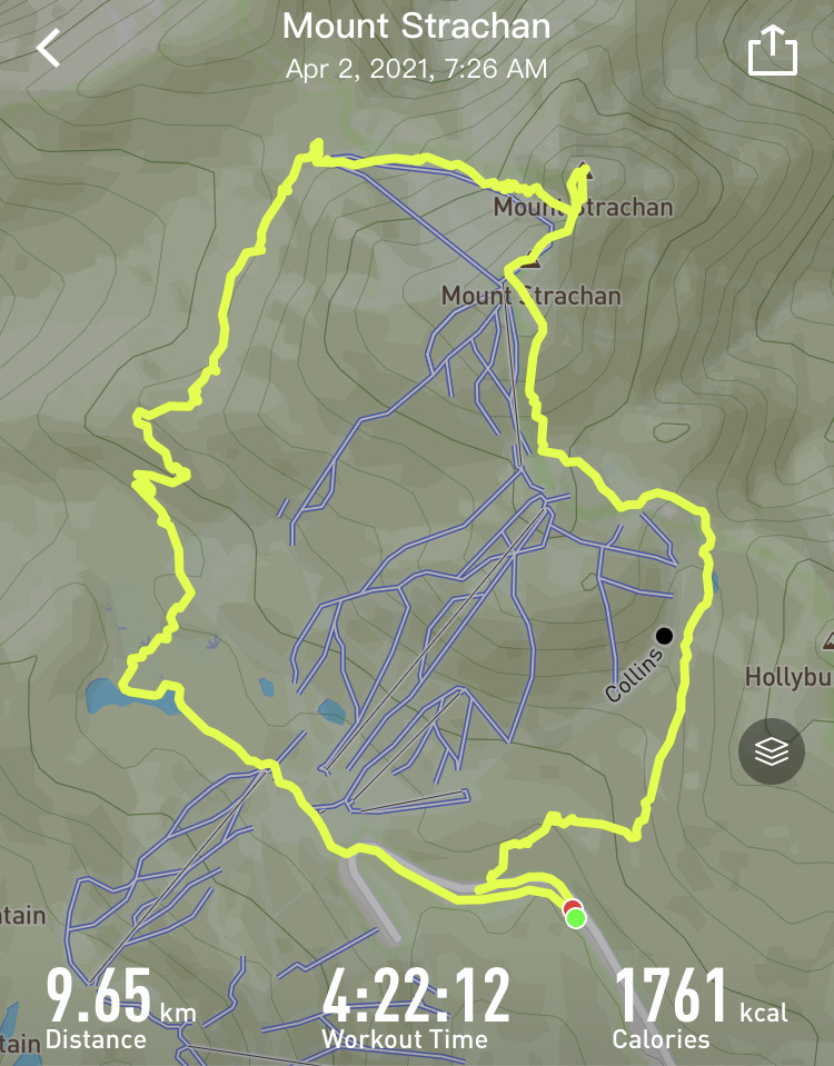 From the South Summit, we made our way to the top of the Sky Chair chairlift and then continued to hike down the Mount Strachan Trail. We thought going down would be relatively easy, but the tracks were not consistent. The trail is not marked, so I constantly checked the FATMAP app. At one point, I realized that we were going down the Old Mount Strachan Trail that would have led us to the Hollyburn Mountain trailhead.