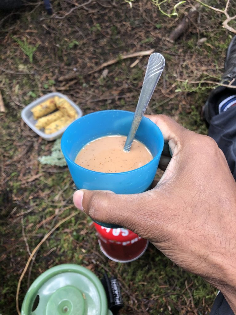 Finally, There was a small clearing in the forest, and we stopped there for a lunch break. I had carried my jetboil and stove. So we boiled some water and made instant chai. Kids got hot chocolate. Some food with a hot drink is what everyone needed.