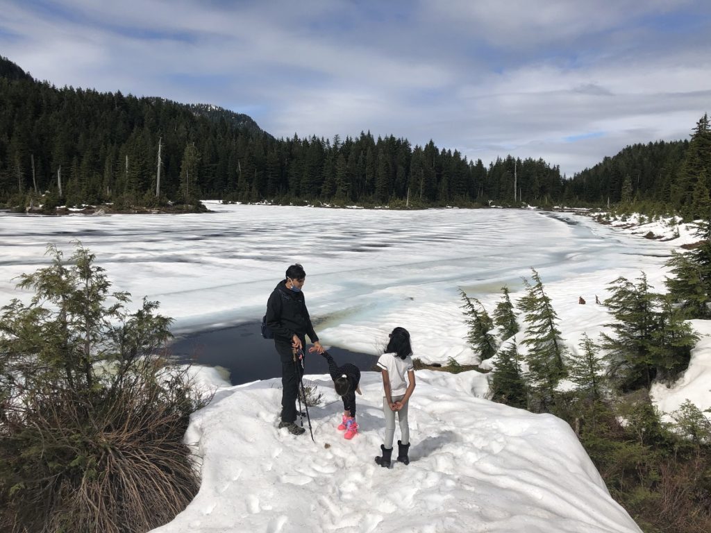 After three hours of hiking, we arrived at the south end of Munro Lake. The lake was partially frozen.
